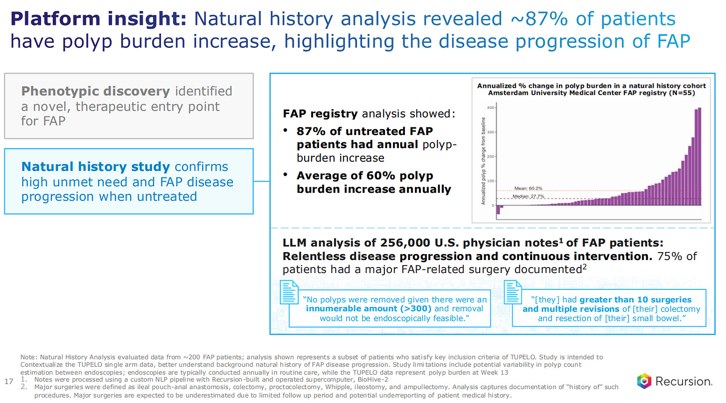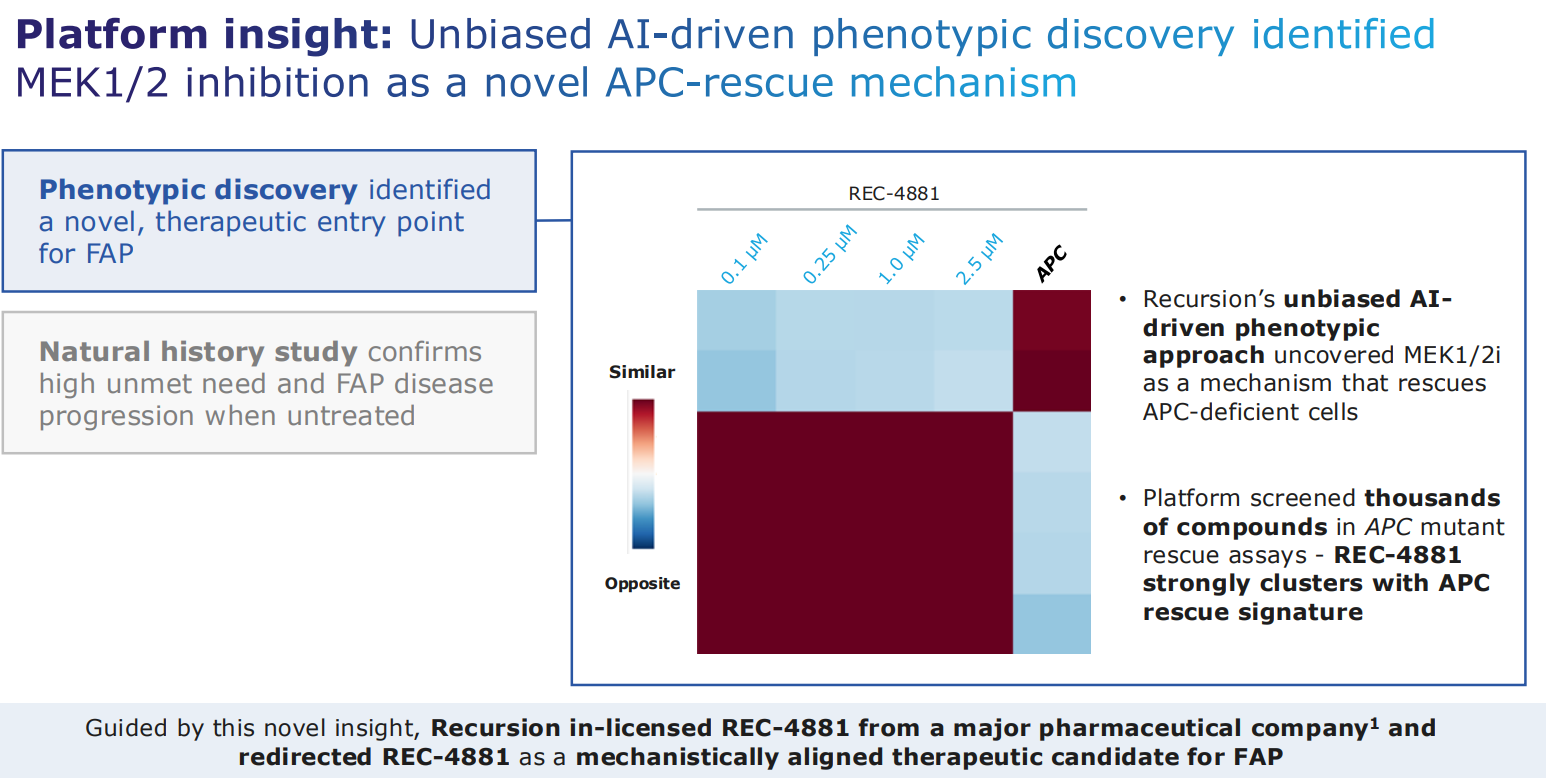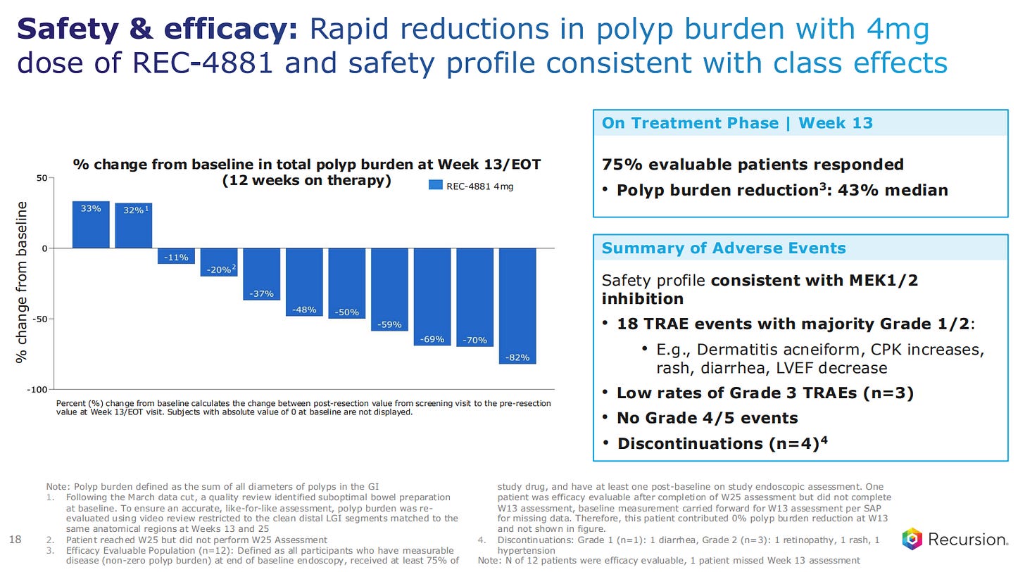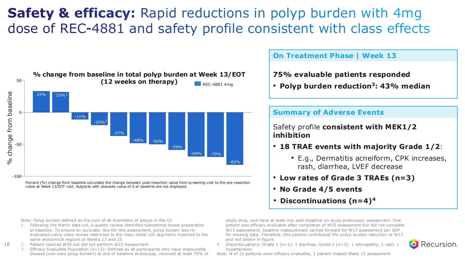 REC-4881 is the first clinical proof-of-concept for the Recursion platform, or the second wave of drug discovery. The drug provides meaningful and durable polyp reduction with a safety profile consistent with the drugs in its class.