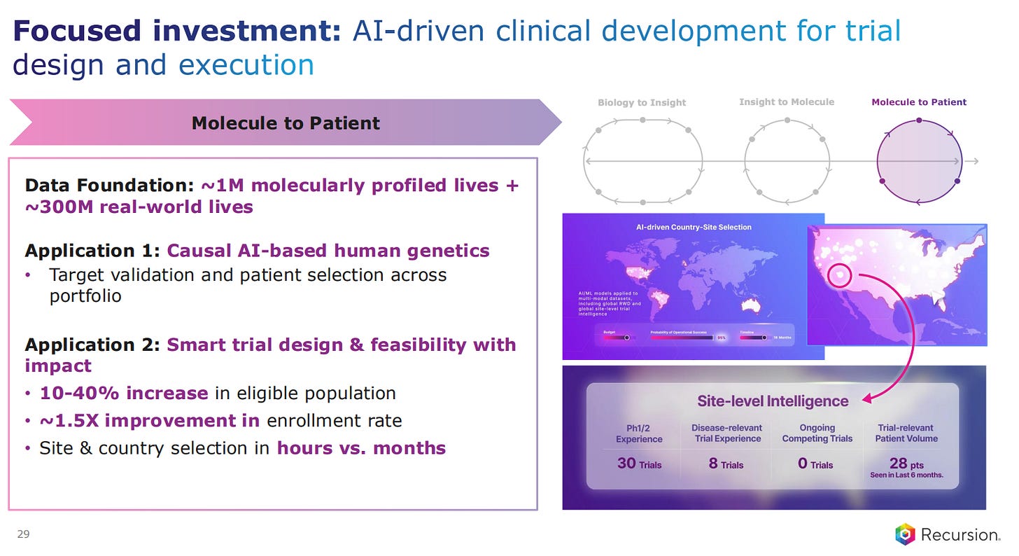 The final part of the pipeline is the clinical development for trial design and execution. Recursion is applying AI-based human genetics modelling to find the causality of the targets, as well as for patient selection.