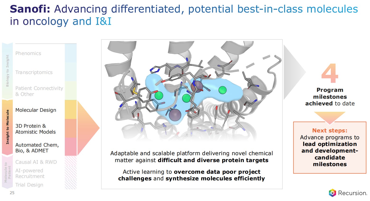 Companies like Sanofi, Roche and Genentech are validating the Recursion platform. Sanofi has several ongoing projects for AI-designed molecules with Recursion, some of which have achieved 4 milestones.