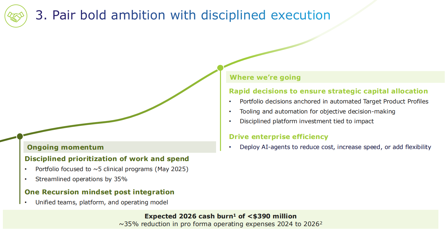 In terms of cash burn, Recursion underwent a Reduction In Force a while ago, which helped in the streamlining of operations by 35%. The company is now focusing on 5 clinical programs. They are running unified teams, platform, and operating model after the acquisition of Exscientia in London.