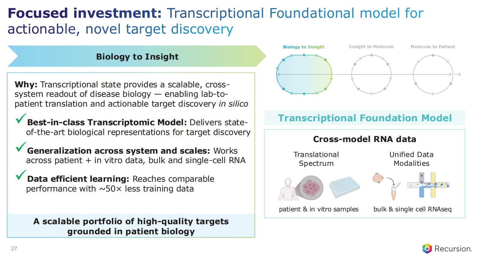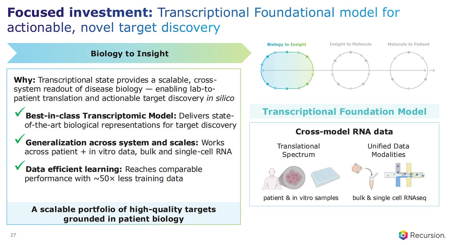 The trend moving forward for Recursion is to integrate omics and patient data with purpose-built models such as transcriptional Foundational Models of the like we’ve seen mentioned in the 10X Genomics JPM26 presentation (see full blog post here).