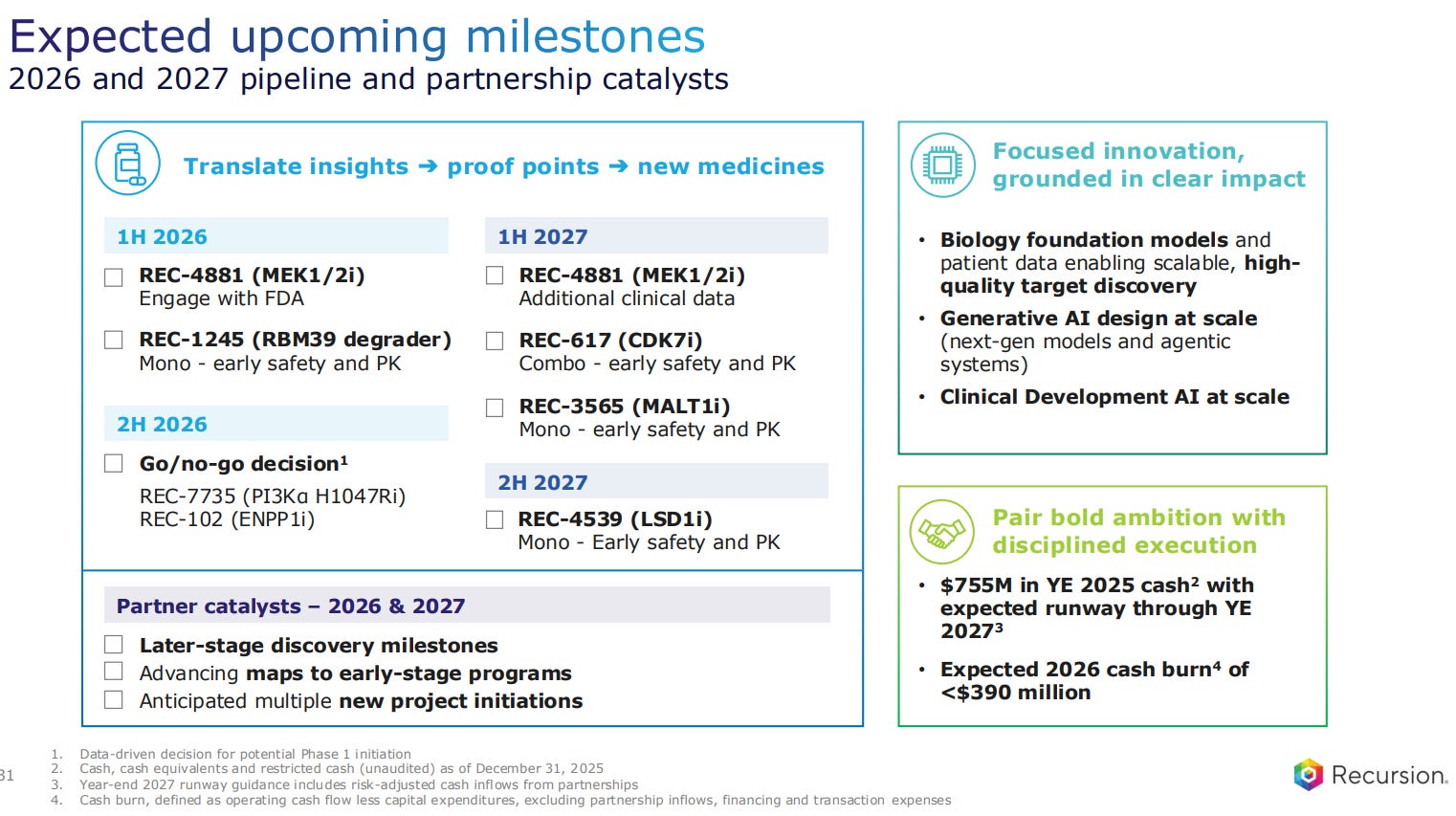 Going to asset by asset analysis, REC-4881 is the most advanced one, with FDA engagement expected in the first half of 2026. REC-617 is a CDK7 inhibitor for advanced solid tumors, expecting to have data in the first half od 2027. After that there are 3 more assets for oncology, all in the Phase 1 for 2026. Finally, the last two assets will have a go/no-go decision made in the second half of 2026.