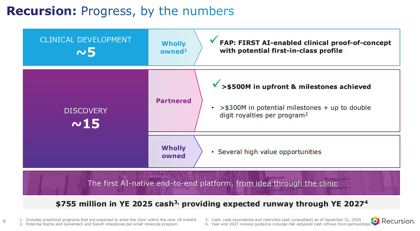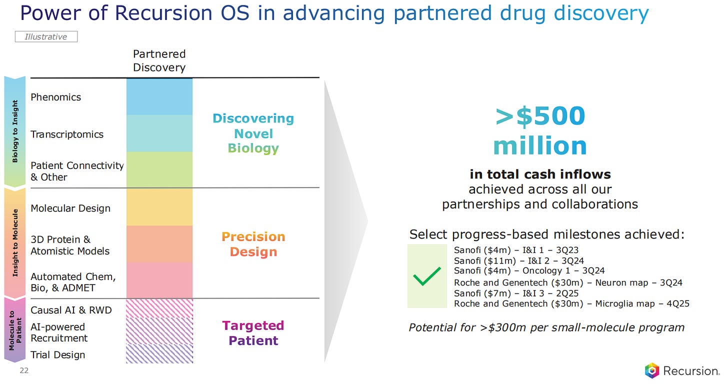 Beyond the five wholly owned assets, Recursion has 15 projects in discovery, many of them through partnerships bringing more than 500 million dollars in upfront and milestones achieved. There are another 300 million dollars in potential milestones and royalties where the percentage take from Recursion could be in the double-digits.